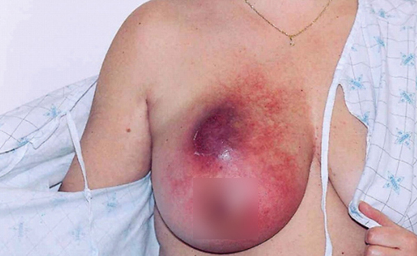 - Vú bị sưng, biến dạng hay kích ứng da vùng vú hoặc vùng dưới cánh tay.